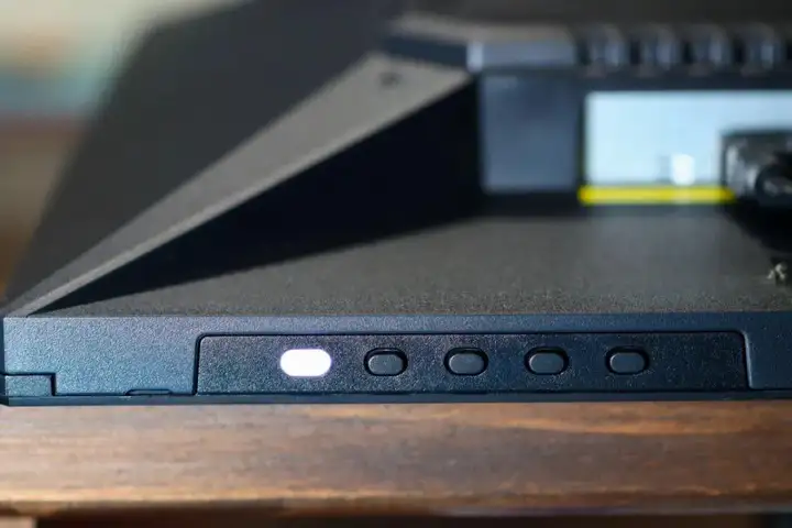 在显示器的底部还设计了多个功能键,最左侧的为电源指示灯。通过这些功能键,可以对显示屏的亮度、对比度等进行调节。