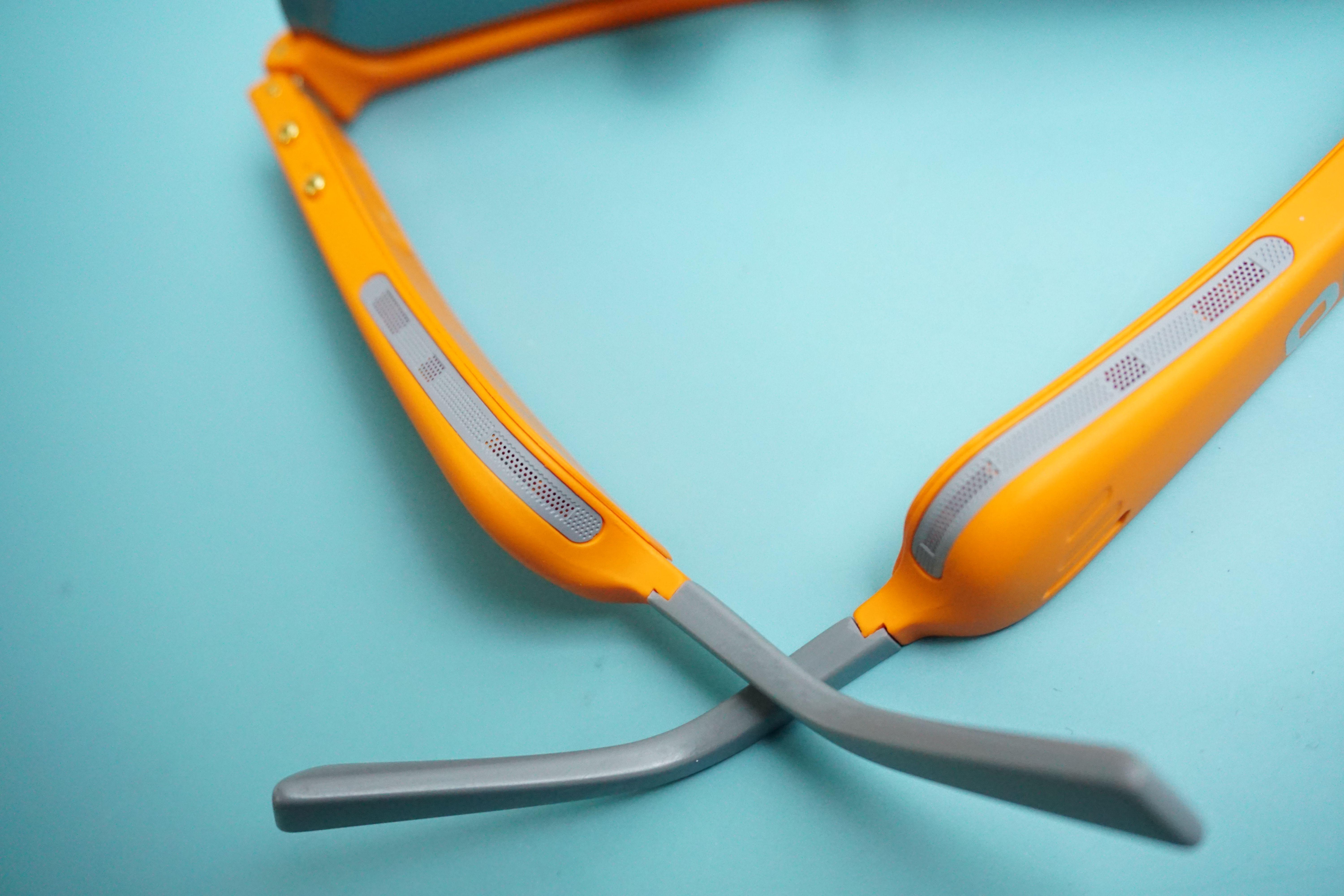 佩戴上使用很舒适,标准镜架的设计符合人体工学原理,不夹脸也不夹鼻,耳挂还支持自由调节可适应不同脸型大小的人群。整体仅有39g负重很低,佩戴后无压力感,和正常佩戴眼镜一般舒适。镜架前后部分不同尺寸设计,挂于耳部也比较牢固,运动或低头都不会松动脱落。
