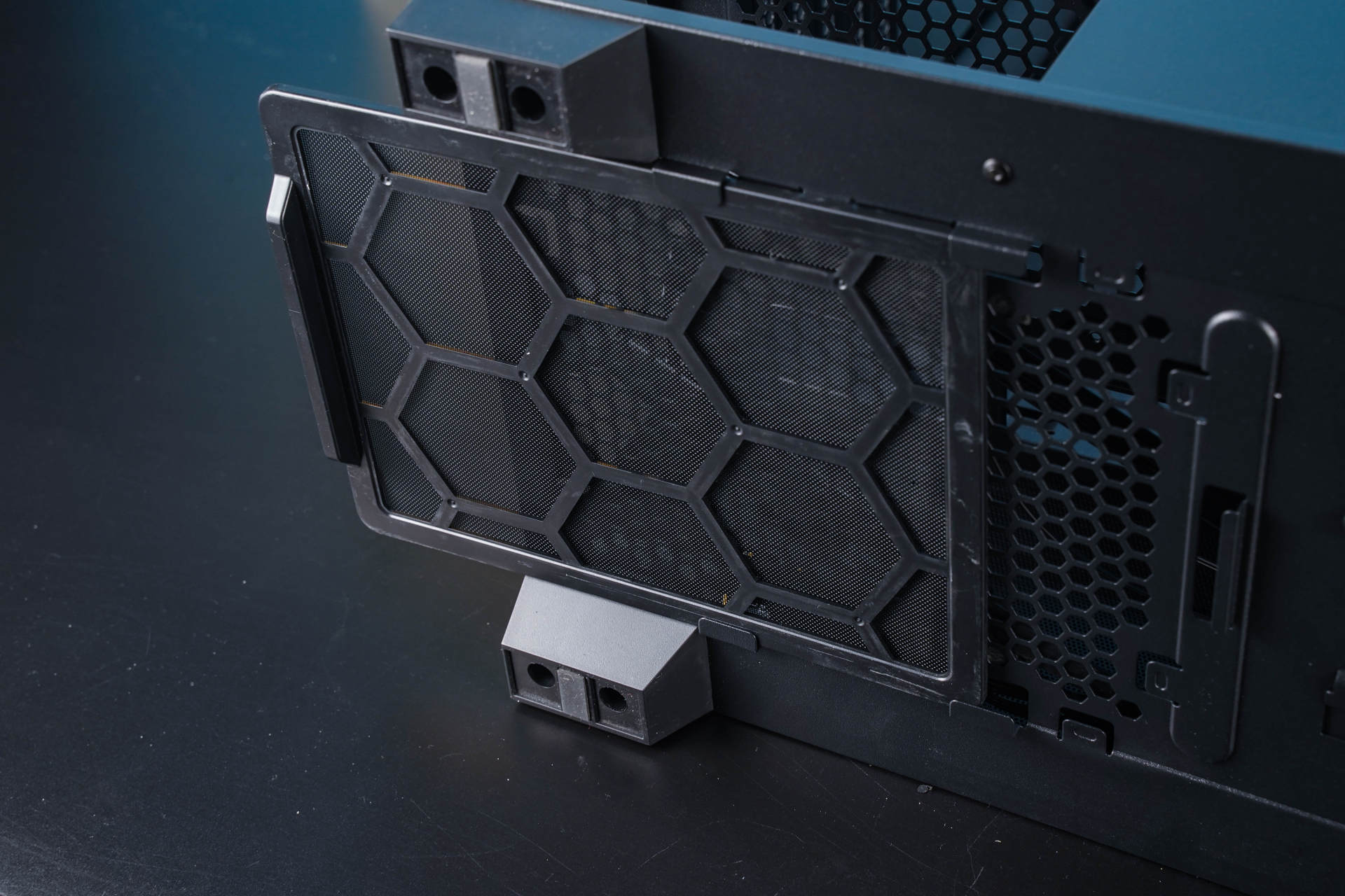另一侧我们可以看出,增加了其它机箱并没有的散热位,可以说将通风散热做到了极致。并且配有防尘网的加持,防尘也是非常到位。