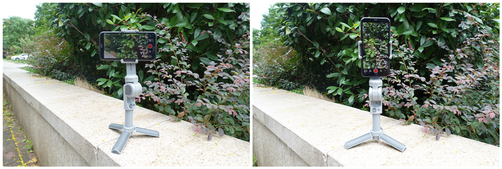 在实际的体验上,跟随模式的操作还是很不错的,稳定器也很稳固,比如在全跟随模式下,云台的俯仰方向和水平方向都会跟随手臂旋转而旋转,又比如在水平跟随模式下,云台只会在水平方向上跟随手臂转动,而不会跟随手臂上下转动。