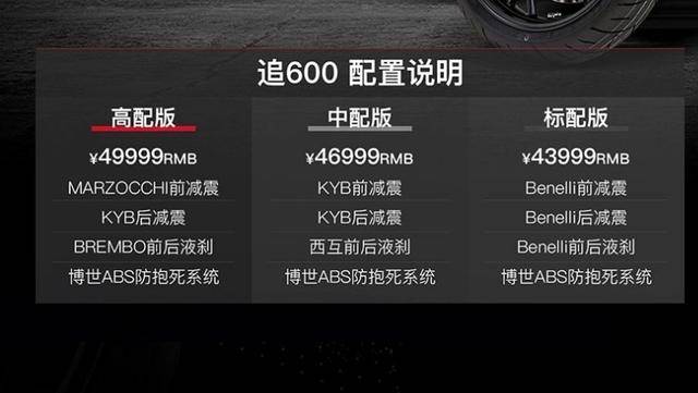 中配和高配的追600的中置后减震是日本的KYB品牌,KYB减震在汽车行业里都算是知名的品牌了,奔驰宝马奥迪等豪华品牌也有采用KYB的产品,所以在一台4万多的机车上配备KYB的后减震,基本上也是诚意满满了。如果能是红色的就运动范更足了。