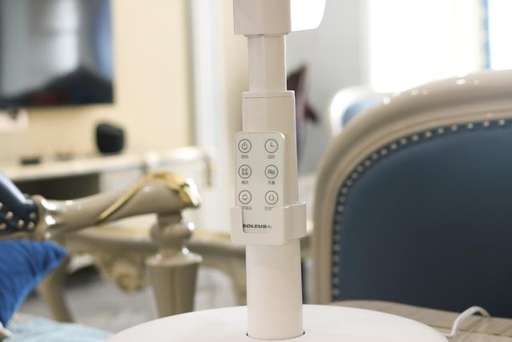 在底座上可以看到它的工作模式,所有按键皆为触控操作,主要有开关机、儿童锁、定时(1、2、6、8小时)、左右摇头、送风模式(标准风、自然风、睡眠风)、上下摇头以及风速加减(1-8档),简洁明了。