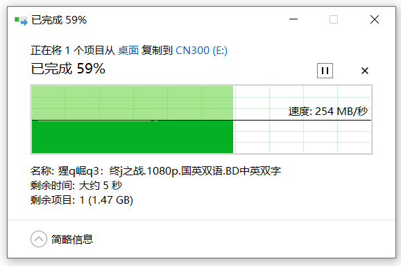 而同样的文件复制进西数移动机械硬盘,速度只有三分之一,也就是需要花三倍的时间。