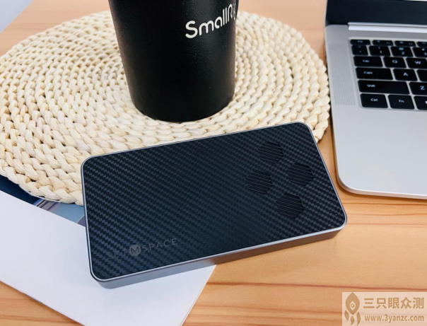 整个机身采用的是铝合金材质,耐磨轻便,有助于散热。正面有合金桌面SETMSPACE的标识,以及四个蜂巢造型的装饰极具特色和辨识度。整体做工精良,边缘采用CNC工艺切割,没有任何毛刺,手感和颜值都非常不错。