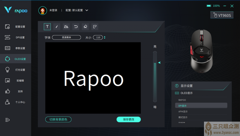 在鼠标的中间位置,雷柏VT960S提供了一块分辨率为64*68的OLED显示屏,这款显示屏能够显示鼠标当时的CPI、回报率、移动里程、APM显示等,还支持自定义内容显示,非常炫酷。