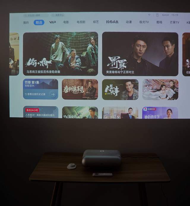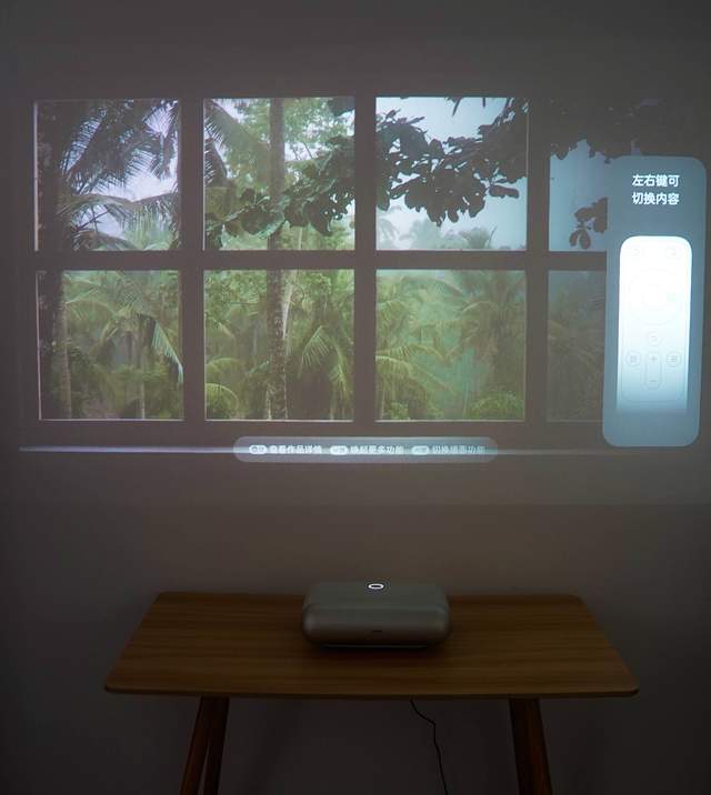 它跟直投的投影仪不同的是它可以通过放在白墙的下方,通过38cm就实现了投屏到100吋的巨幕上,画面效果非常不错。它不像传统的投影仪一样需要我不断的往后调整距离,寻找一个最佳的投影距离。