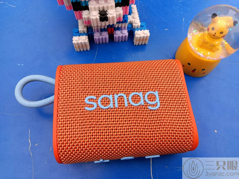 音箱的正面是Sanag的logo,侧面是大大的“开关”和音量大、小按钮,简洁又明了,傻瓜式的操作,一看便会。加上纯色的织布包裹,设计感和质感都在线。