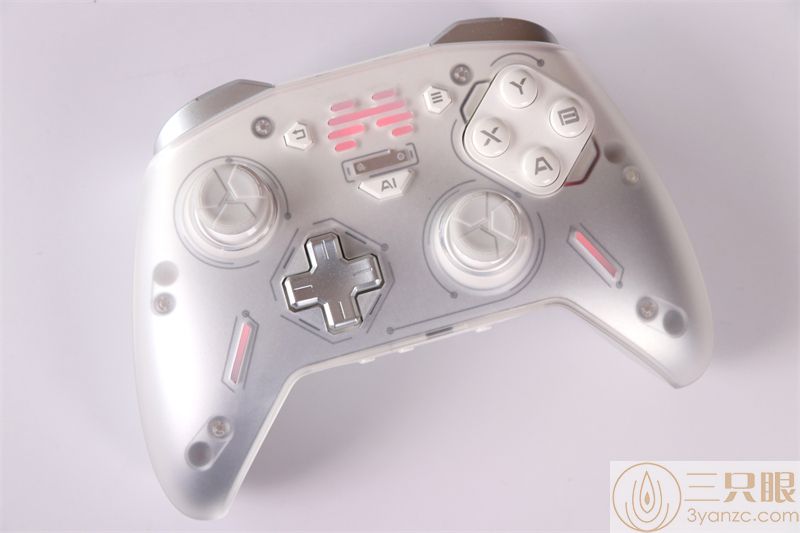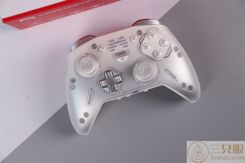 我入手的是白色款,这款宙斯2的外观颜值相当漂亮,白色+银色的渐变机身,再加上磨砂质感的面盖,给人一种渐变朦胧,晶莹剔透的感觉,如同吉祥物冰墩墩那样。它的按键和摇杆布局采用的XBox非对称布局。