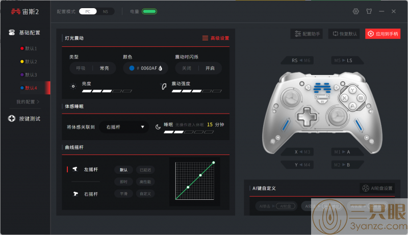 相关配套的软件名称为:北通游戏厅,下载和安装我这里就不说了,直接来看下软件的界面设计和功能吧。这款软件功能非常丰富,可以自定义设定的功能很多,比如灯光的灯效,震动的强度,左右摇杆的灵敏度等都是可以按照玩家需求去自定义的。不过有些参数并不一定一次就能设置好,需要多次尝试才可以,比如摇杆与体感灵敏度参数,对一些有些不熟悉的参数,选择默认值就好。