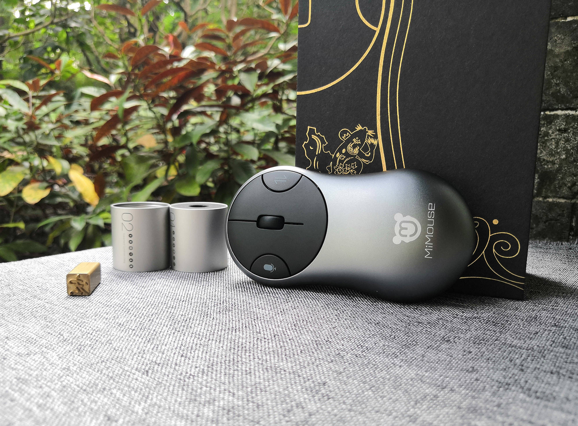 咪鼠智能语音鼠标S的外包装,属于那种尊贵型的礼盒式设计,有种传统复古的高级感。包装以黑为底,搭配中国传统的简笔画画法,金色线条、咪鼠金色印章落款,沉稳大气,满满的经典复古气息。