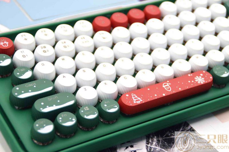 本次体验的绿野星踪版本的雷柏ralemo Pre 5,整体配色采用了雪夜圣诞节的键帽画风,键盘底色配以圣诞树的绿色,主键区键帽采用雪白色,左右两侧的功能键区同样采用绿色,但配以白色的飘雪图案,此外,Esc、Enter和Space键则采用红色键帽配以圣诞节相关的白色图案,例如麋鹿头像、圣诞老人头像、圣诞树、袜子、雪花等,主键区上方的F5-F8虽然同样也是红色键帽,但并没有过多的图案修饰,但给主键区的色彩增加了不少层次感。
