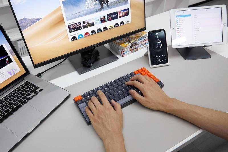 最后,键盘兼容性问题一定不能忽视。这把ku102机械键盘兼容台式,Macbook、MateBook、ipad等设备,支持Mac OS、Linux主流操作系统使用,提供有线与蓝牙3.0/5.0两种连接方式,至多连接4台设备,一台有线、三台蓝牙,按组合键Fn+1/2/3即可切换不同的设备,无论是什么系统都能无缝切换使用,不再需要频繁插拔数据线,多设备党不免都嘴角上扬。