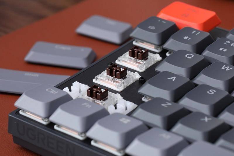 轴体永远是买键盘看重的第一因素。绿联ku102机械键盘搭载的是高特薄型LP矮茶轴,键程为3mm左右,触达压力为55g,没有青轴的那种咔哒声,却拥有微段落感,同时手感更轻柔舒适。