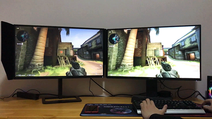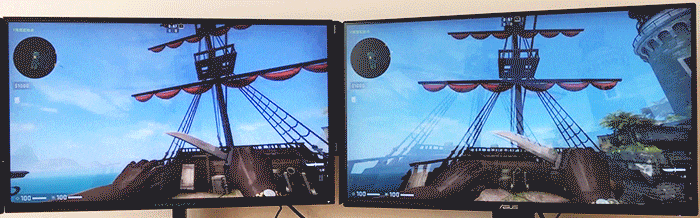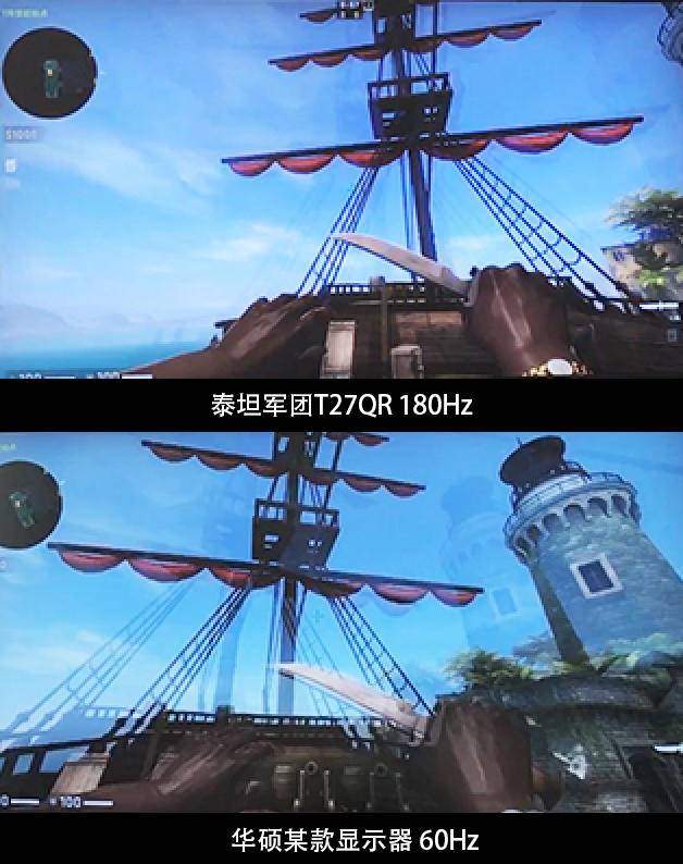 图中左为泰坦军团T27QR显示器180hz,右为华硕某款60hz显示器,测试在同一台主机上,双屏同步完成,不存在硬件差异,播放速度为10%倍速播放。动图如果看不太清楚,我们继续看下一张对比图。