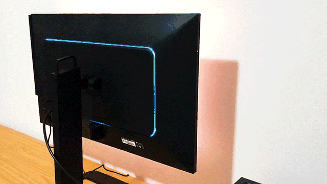 背板的rgb灯条最佳设置为呼吸灯渐变色模式,否则只能设置为单色模式。灯条虽好,可惜太窄,发光量不足以通过墙壁反射,正常使用(背面靠墙)状态下,也就很难能感受到显示器的灯效加成了。