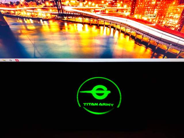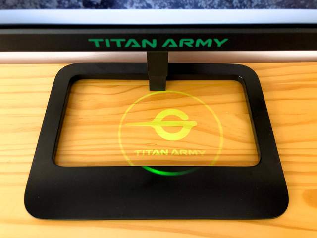 显示器背面类似梯形结构,内侧的矩形为RGB灯带,可惜有点窄,灯效范围自然也不会太大;从显示器背面可以看到支架的纤细程度。我留意了一下,泰坦军团的显示器,支架大部分都是这种纤细风格的设计。