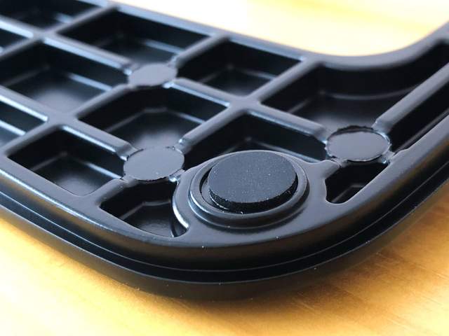 底座底部的四角还有多个防滑垫片,保护桌面避免划算,也能在震动时起到一些静音缓冲效果。