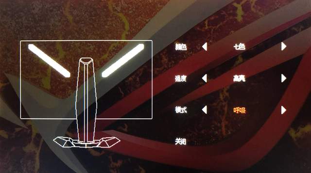 显示器背面的灯带设置功能也不多,“颜色”除了“七彩”(呼吸灯渐变)外,只剩纯色可选;“强度”当然是高亮了,本来就很细的一条灯带了,“模式”不可调节,只能选“呼吸”。