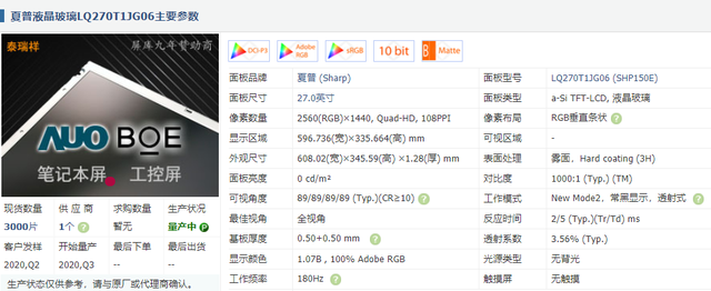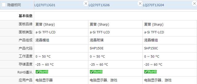 继续对比的话,可以发现三款型号的夏普面板,最大的区别即在刷新率上,分别是60hz,180hz,240hz。很明显,中间这款180hz的夏普面板:LQ270T1JG06,就是我们寻找的目标了。