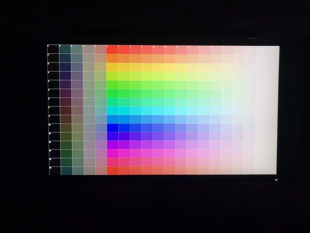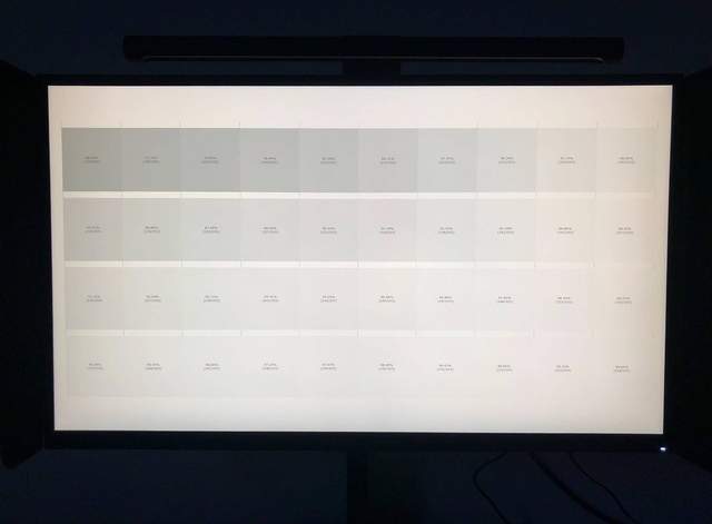 显示器为亮度100%状态,灰阶图测试中,可以看到右下角的最后一格白色灰阶为拍摄误差,实际肉眼可见。色块检测部分由于全屏纯色太过刺眼,就不再展示了,直接说结论吧:无亮点,无坏点,完美屏。