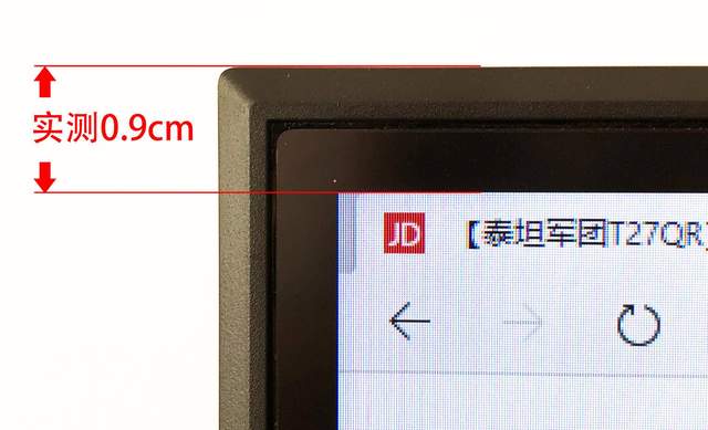 泰坦军团T27QR为窄边框设计,但是由于显示器面板内侧仍然存在0.5cm的黑边,所以外壳加显示器的黑边合计,仍然有接近1cm的宽度。