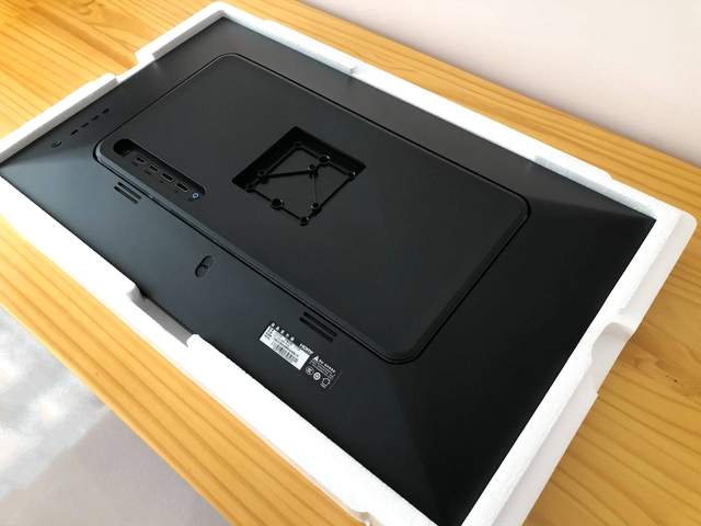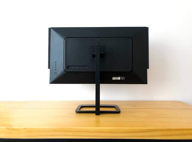 显示器的支架相对纤细,顶部还设计了一个提手拉环,来帮助移动显示器。通用的VESA标准接口,可以支持第三方支架,或者壁挂式安装。