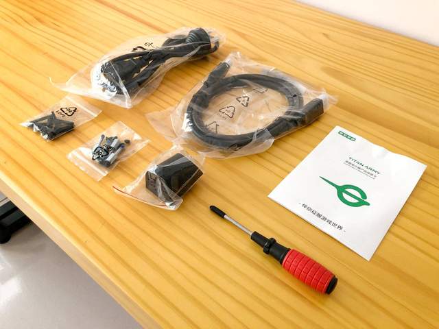最后是随机的附赠配件,包括电源线,1根DP线,镭射发生器,说明书,和螺丝若干。标配不含HDMI线有点伤,不过送的磁吸螺丝刀还挺好用的。
