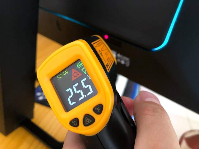 显示器背面的散热孔,温度反而不高,大约25.5摄氏度。整个显示器的背面的温度,普遍低于正面的同位置温度。