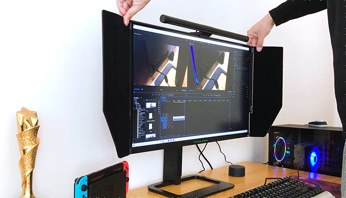 左右两侧各带一枚不规则的分体遮光板。显示器上方位置,正好可以留给显示器挂灯。
