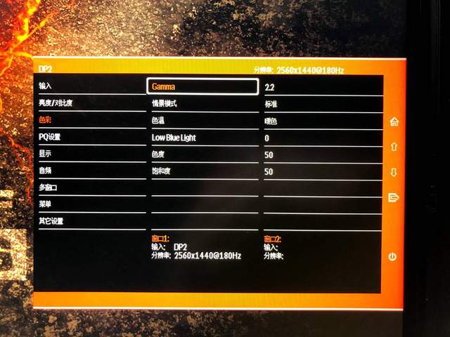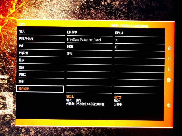 “音频”:调节音量大小,“多窗口”功能针对多屏设计,“菜单”修改OSD的语言和显示时间。较为重要的是“其他设置”,除了可以显示DP版本,还需要开启重要的HDR和FreeSync功能。显示器默认为关闭状态,入手后记得第一时间开启。