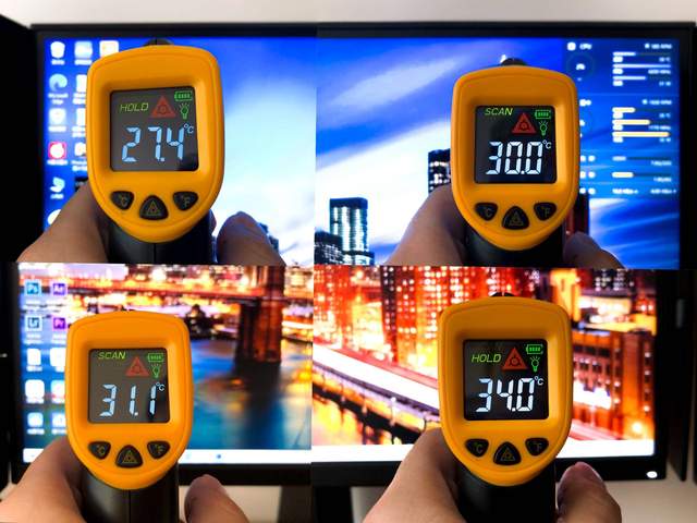 室温22摄氏度的环境下,显示器的工作温度稳定在30摄氏度左右,温度最高的部位在显示器的电源接口位置,为34摄氏度。
