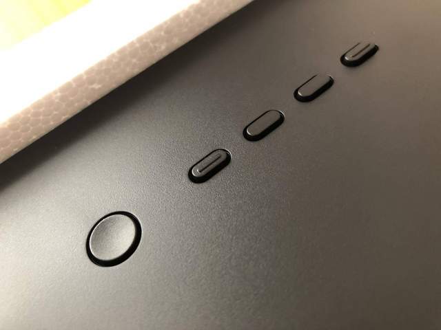 显示器背面有五个操控按钮,圆形按键为电源键,缺少遥感操控有些别扭。本应在显示器侧板上的图形提示,也因为遮光板的存在而取消了,操控OSD的时候,只能靠手摸了。