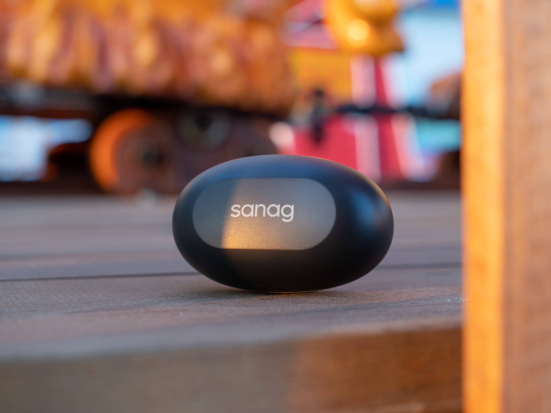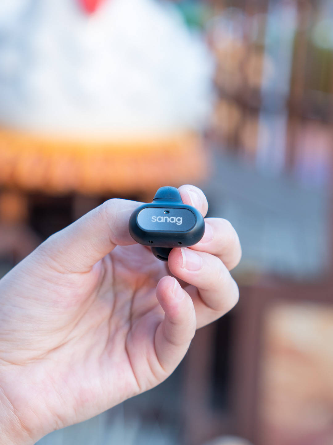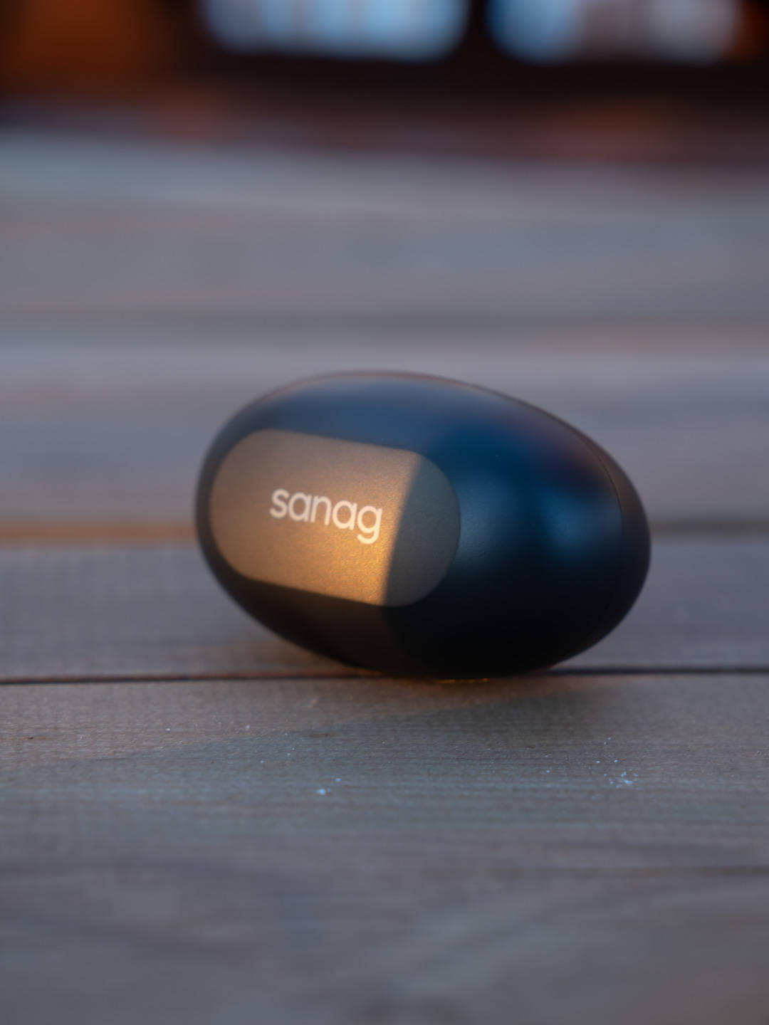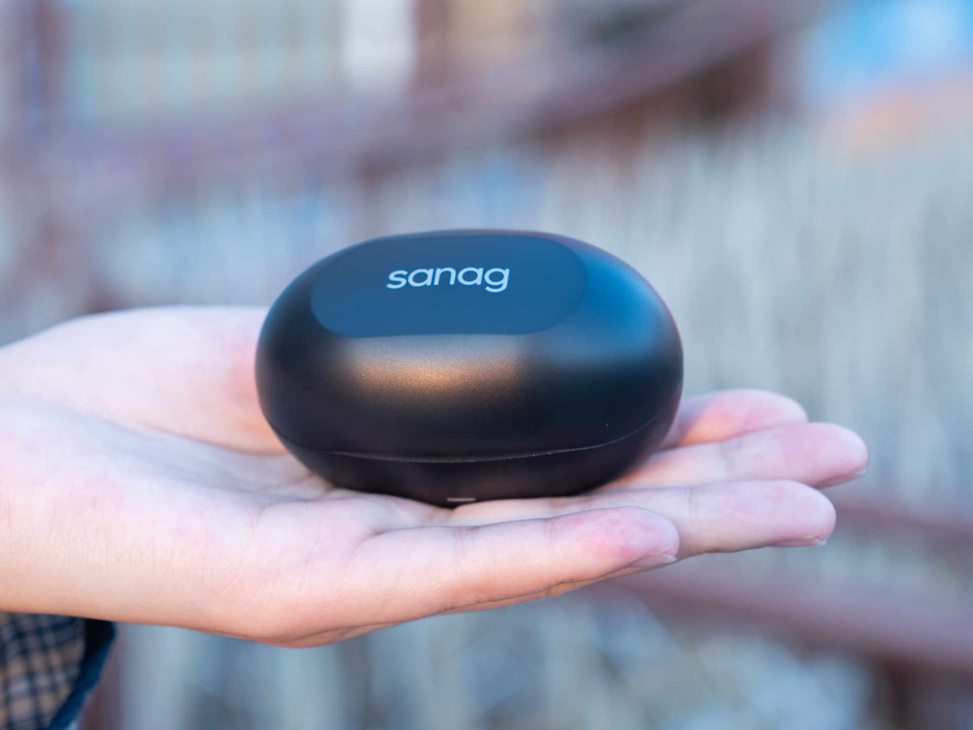 耳机充电舱采用的是比较常见的鹅卵石造型设计,顶部印有“sanag”字样,正前是一颗状态指示灯,背面为Type-c充电接口,传统的磁吸式开盖设计,开合阻尼适中。整体外观小巧方便随身携带,边缘过度圆润也不怕割伤包包。
