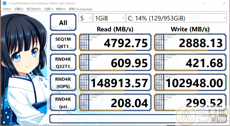 4792.75MB/S,写入速度2888.13MB/S。读写速度相比机械硬盘来说,快的实在太多太多了,做系统盘运行操作系统或玩大型游戏,那不得起飞咯。