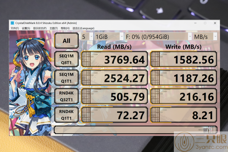 在常用的CrystalDiskMark进行全项测速,得出连续读取速度为3769.64MB/s,连续写入速度为1582.56MB/s,这个结果在外置硬盘中的表现已经非常出色了。