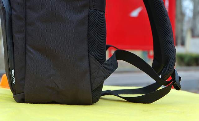 Incase Facet双肩背包肩带处、前置口袋侧面缝有Incase经典logo,白色logo更加醒目,夜间车灯打来可以反光,提高用户夜行安全。另外左右肩带均设有上图可以插东西的横向布条,可以插闪光灯、反光条、运动相机等等,同时也可以挂小饰物。