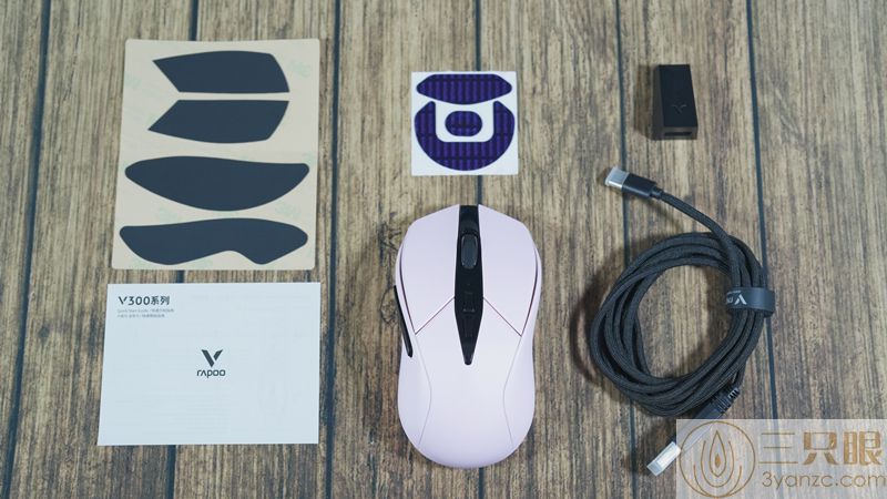 ▲包装配件包括:雷柏V300 PRO鼠标、数据线、转接头、防滑贴、备用脚贴、说明书保卡。雷柏是我见过唯一配置胶贴和防滑指贴的品牌,非常厚道。