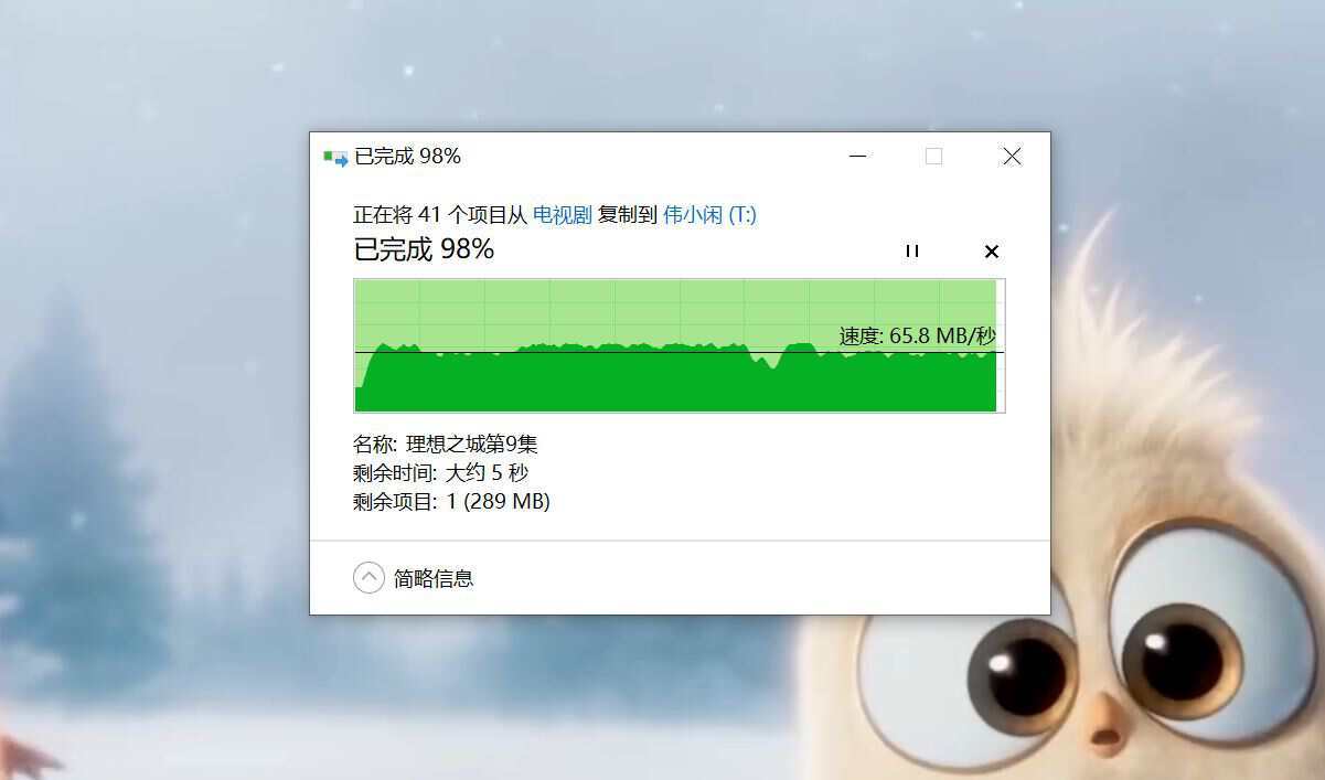 电影、电视剧等大文件传输,除了要追求瞬时速度快以外,还要求其稳定不断连。移动硬盘导个电视剧进去,连续稳定在65.8MB/s的效率——机械硬盘的传输速度确实稍低一些。。。