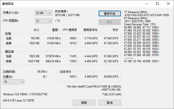 接下来,使用7-ZIP对JAZER棘蛇DDR4 做了测试。7-zip等压缩类软件在进行压缩和解压缩操作时会占用大量的计算资源和内存资源,因此对内存频率比较敏感。如果内存频率较高,可以提高电脑的整体性能,从而加快压缩和解压缩的速度,侧面也反映出了内存的运行品质和性能情况。从图中给出的压缩评分解压缩评分来看,是完全够用的。