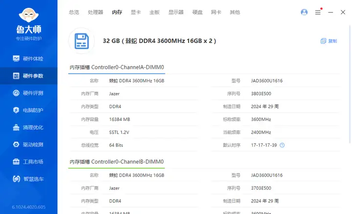 上图是内存的具体参数,制造日期为2024年29周,当前频率为2400MHz。
