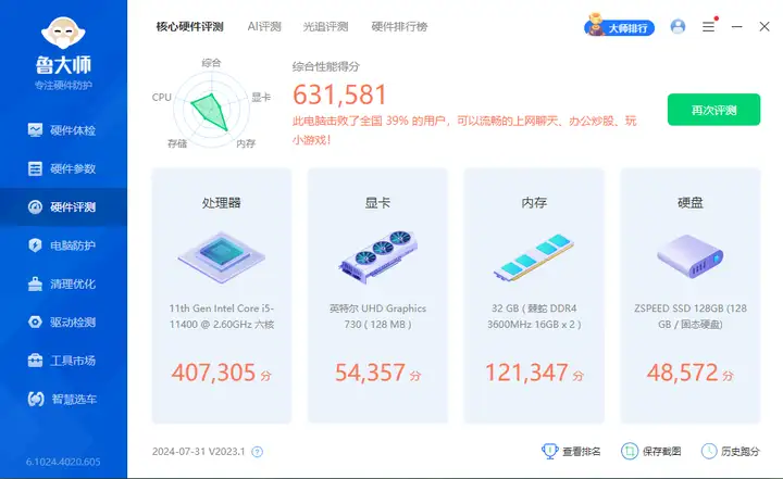 此时,用鲁大师跑分,分数为631581,其中内存跑分上升到了121347分,107940分,提升了12%。