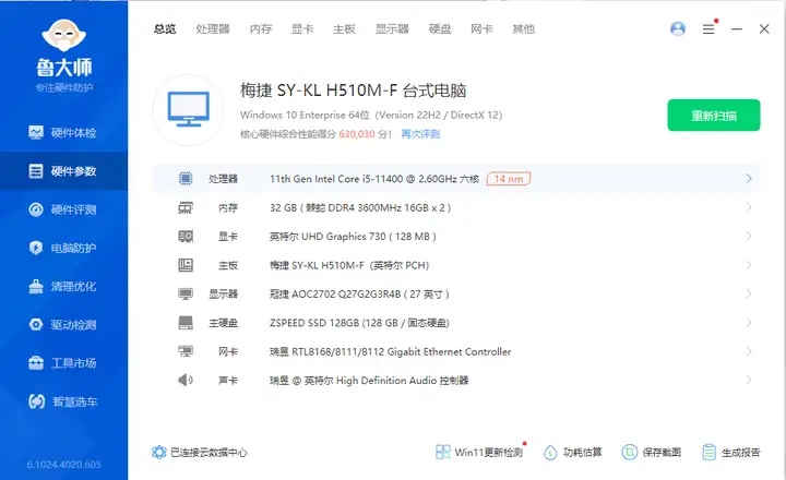 先来看下,我这台垃圾电脑的配置吧,CPU是酷睿i5 11400,主板是梅捷H510M-F。至于梅捷这个品牌,估计没多少人知道吧,主打一个能用。