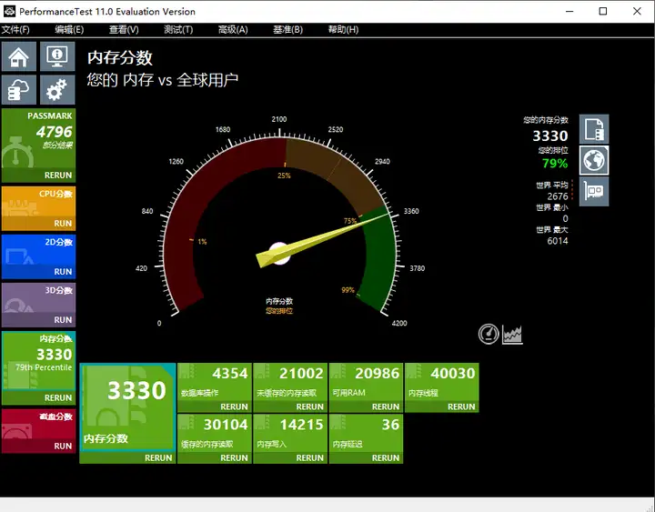 使用PerformanceTest跑个分,从测试成果来看,内存的评价分数为3330,全球排名79%。