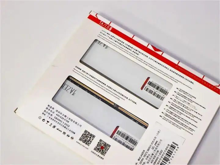 包装背面设计了两个透明天窗,透过天窗可以看到,JAZER棘蛇DDR4 自带有散热马夹,相比电脑原来采用的三星普条要高级了不少。