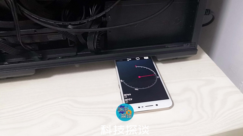 为了了解下电源在工作时的噪声,首先测试了一下环境中的当前的声音分贝数,从手机应用App中数值显示可知,当前环境42分贝,最大44分贝。