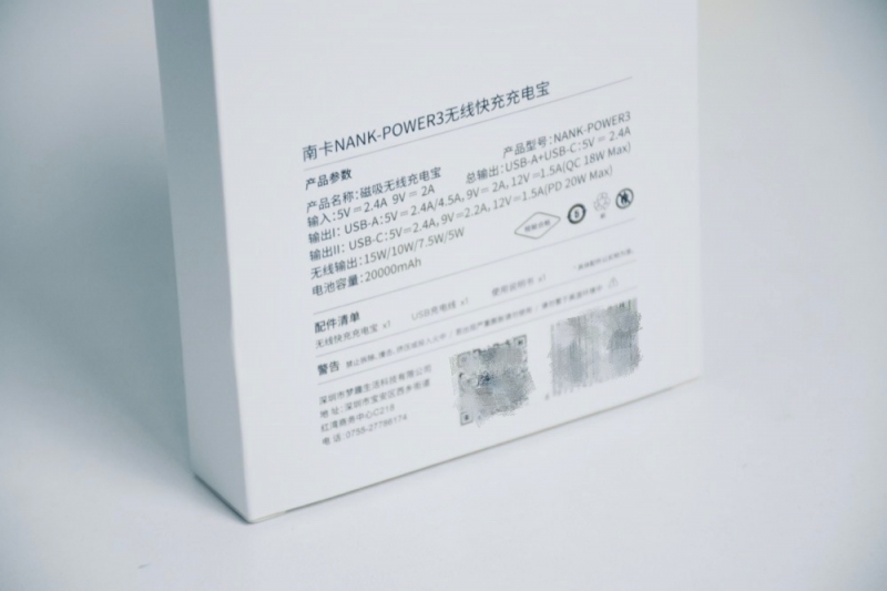 南卡无线充电宝POW3沿袭上一代,没有什么变化,主题白色的设计,搭配产品logo和产品名称,背面印有产品相关参数!