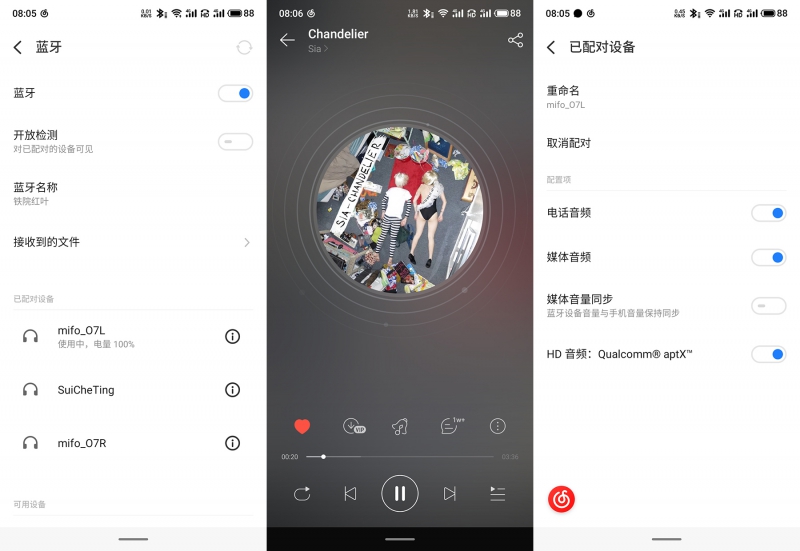 1.音频解码技术,这个直接决定着耳机工作的稳定性,魔浪mifo O7采用的是高通Qualcomm芯片,其音频协议支持两个耳机主副切换,市面上大部分TWS耳机都会分主副耳机,只有主耳机工作时,副耳机才能连接工作,一旦主耳机未启动,副耳机形同虚设;而魔浪mifo O7能够实现主副耳机自由切换,双耳互联成功后, 随意开关任意一只耳机都能正常使用。
