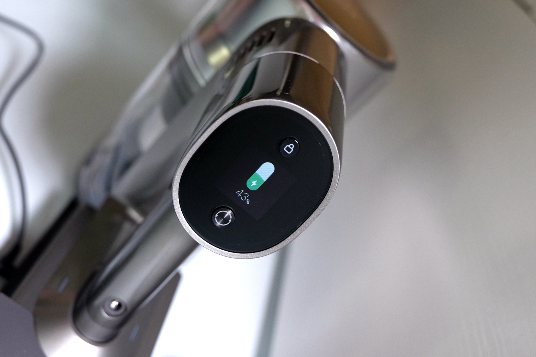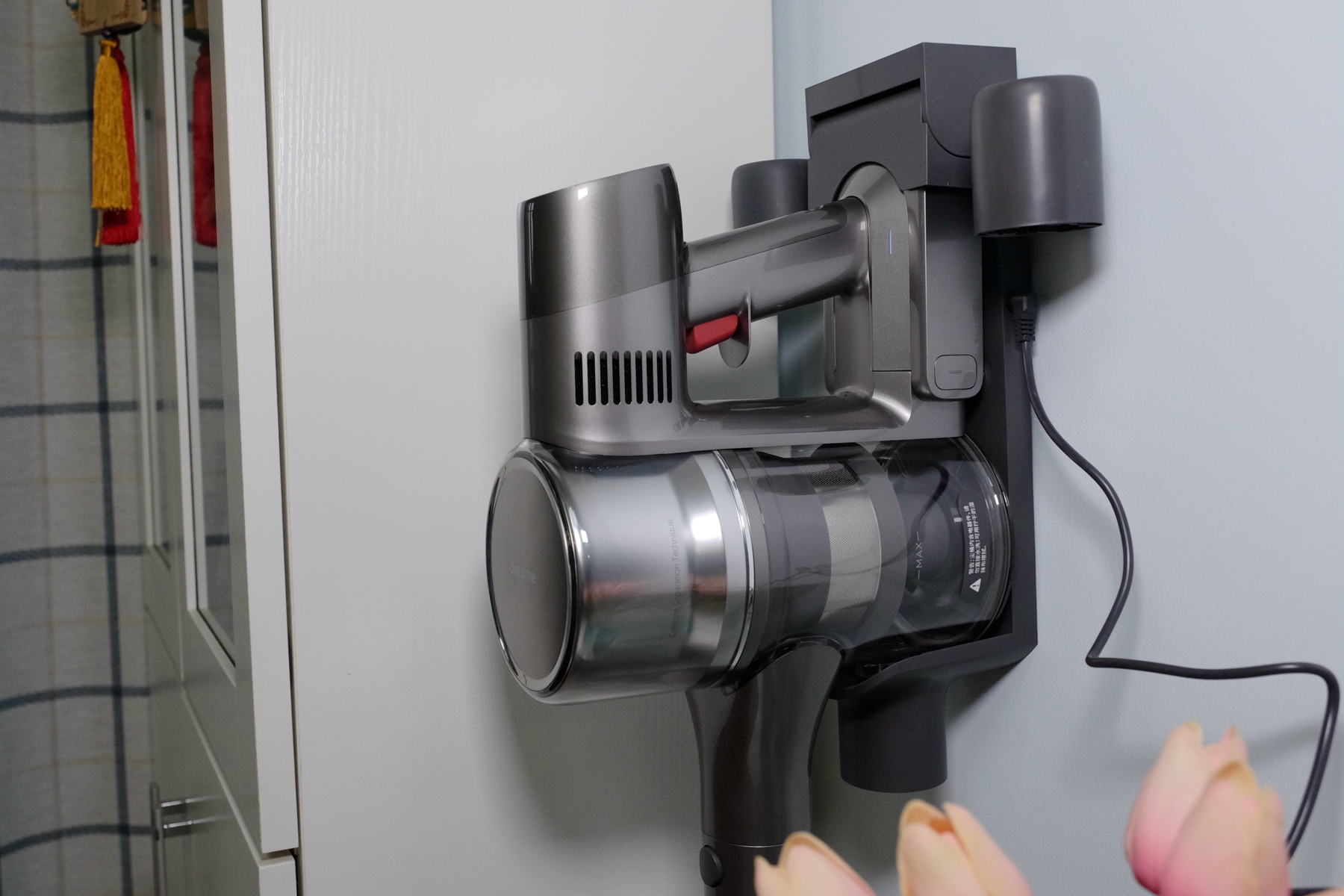 主机和支架都带有充电极片,当把吸尘器挂在支架时,极片相触便自动充电,主机上的彩色显示屏亮起并显示充电状态,主机的当前电量情况一目了然。