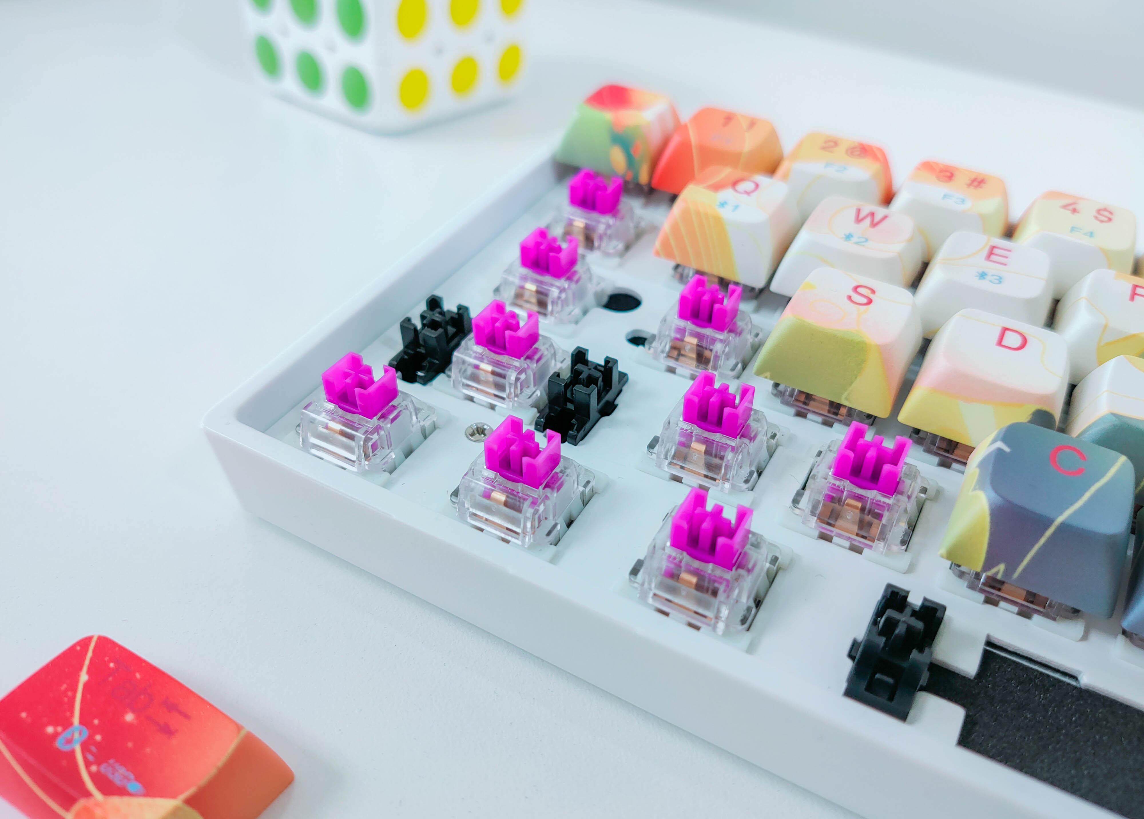 热插拔轴座机械键盘诞生后,我们只需要用拔轴器取出原有的轴体,再徒手安上更换的轴体即可,工作量瞬间降低90%。而新贵GM680双模机械键盘正是这样一款热插拔轴座机械键盘,可以兼容市面上大部分的三角轴体,也就是说我们即使想尝试其它轴体也只需要购买散轴回来更换,甚至可以在一把键盘上体验青、红、茶、紫等不同的轴体。