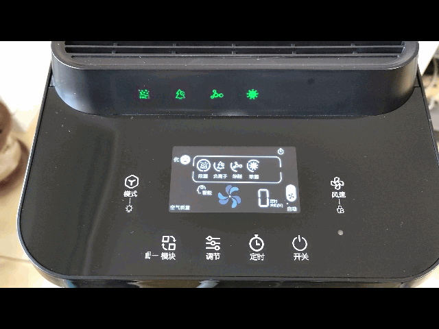 接通电源后可以看到三个亮起的区域,一是位于出风口侧立面的模块指示灯,用亮起代表已安装某模块,用亮起的不同颜色来代表工作状态,二是3.5英寸显示屏,所有的空气状态、净化器状态、净化模式、设置等均在该屏幕上显示,三是位于控制模块正面的空气质量灯,用于反映当前的空气质量状态。